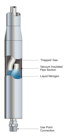 Внутренние газовые ловушки, как правило, установлены в вертикальном положении перед зоной использования жидкого азота, на не защищенном вакуумной изоляцией окончании. Газ ловушка работает по принципу захвата в карман газа внутри трубы, когда поступление жидкого азота перекрыто. Этот газовый карман предотвращает контакт жидкого азота с поверхностью без вакуумной изоляции, по сути изолируя соединения.